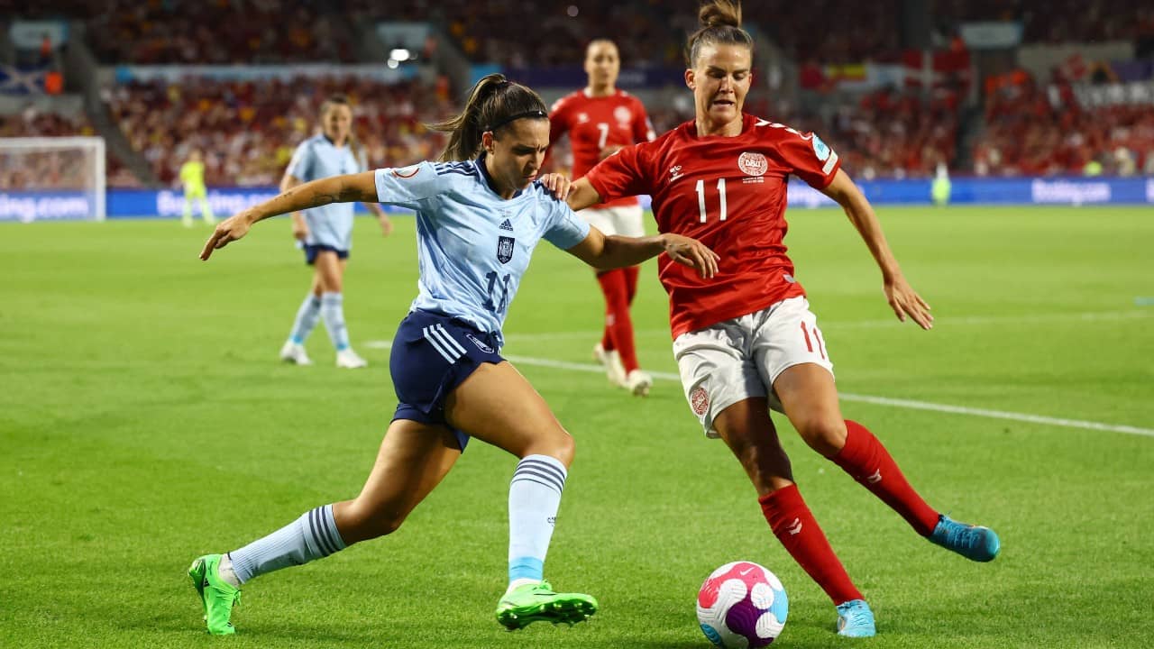 ব্রেন্টফোর্ড কমিউনিটি স্টেডিয়ামে মেয়েদের ইউরো কাপের (UEFA Women's EURO Cup) গ্রুপ-বি-এর ম্যাচে ডেনমার্কের (Denmark) বিরুদ্ধে নেমেছিল স্পেন (Spain)। (ছবি-উয়েফা ওমেন্স ইউরো ২০২২ টুইটার)