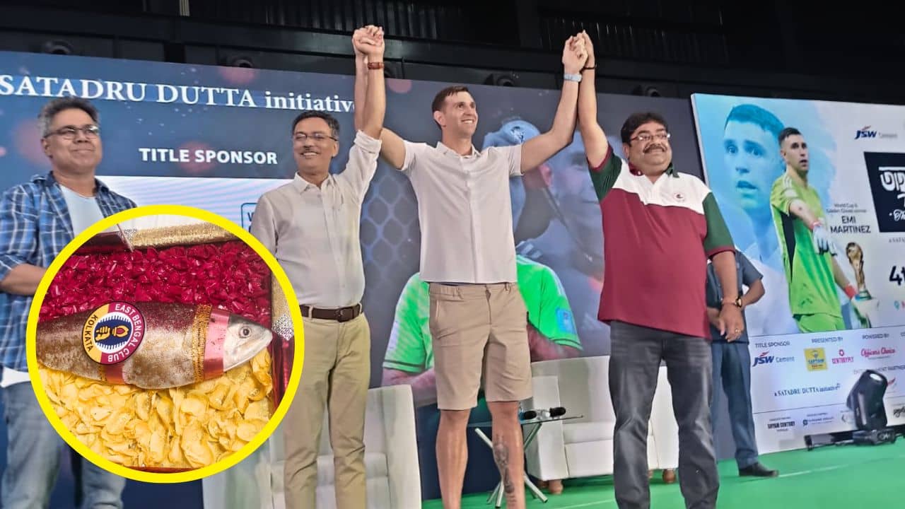 এদিন ইস্টবেঙ্গলের তরফে মার্টিনেজের হাতে তুলে দেওয়া হয় ইলিশ মাছ ও মিষ্টির হাঁড়ি। (ছবি নিজস্ব)