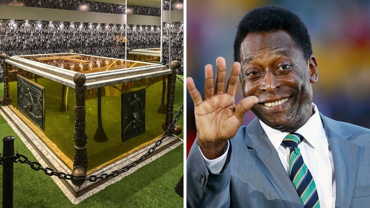 সোনার কফিনে শায়িত রয়েছেন পেলে। তাঁর সমাধি ওপর একটি বিশাল বড় ক্রস রয়েছে। (ছবি-টুইটার)