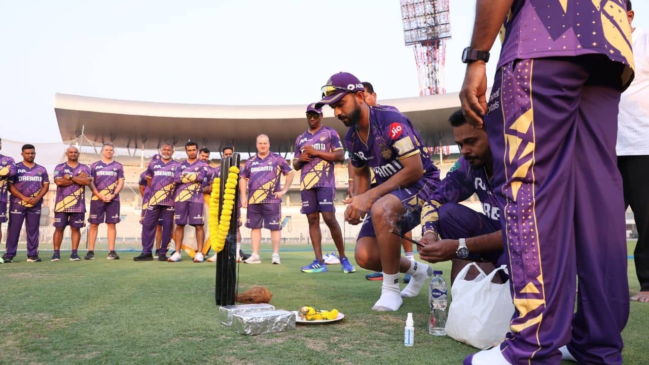 ইডেন গার্ডেন্সে কলকাতা নাইট রাইডার্সের ক্রিকেটাররা প্রথা মেনে অনুশীলন শুরু করার আগে পুজো করেছেন। (ছবি-কেকেআর)