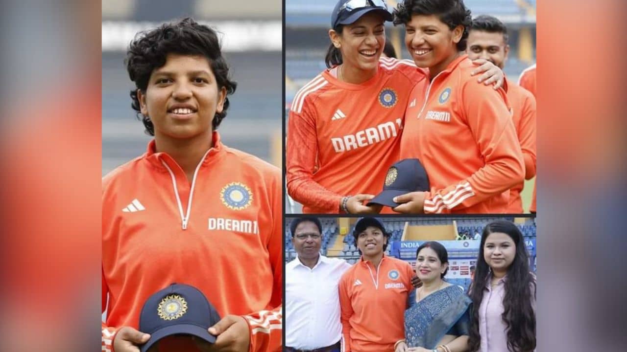 রিচার অভিষেকের মুহূর্তের সাক্ষী থাকল মুম্বইয়ের ওয়াংখেড়ে স্টেডিয়াম। রিচাকে ডেবিউ ক্যাপ পরিয়ে দিলেন তাঁর সহ-অধিনায়ক স্মৃতি মান্ধানা।(ছবি:সোশ্যাল মিডিয়া)