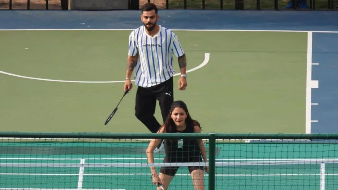 কালো স্লিভলেস টি-শার্ট এবং কালো শর্টসে বিরাটের পাশে অনুষ্কারও স্পোর্টি লুক। দু'জনেই ব্যাডমিন্টন স্কিল দেখালেন। (ছবি:টুইটার)