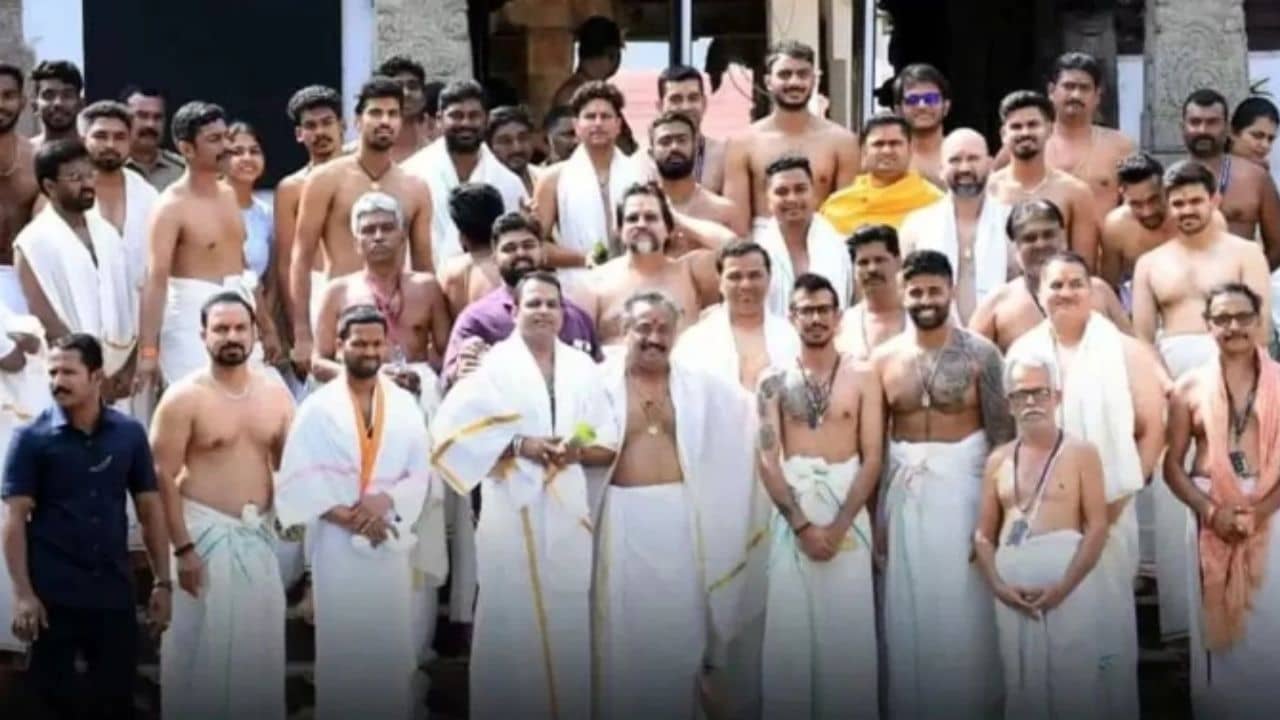 শতাব্দী প্রাচীন এই মন্দিরে মেন ইন ব্লুদের দেখা গেল ঐতিহ্য মেনে সাদা ধুতি পরতে। আদুলে গায়ে সাদা ধুতি পরে দেখা গেল টিম ইন্ডিয়াকে। ছবি: টুইটার