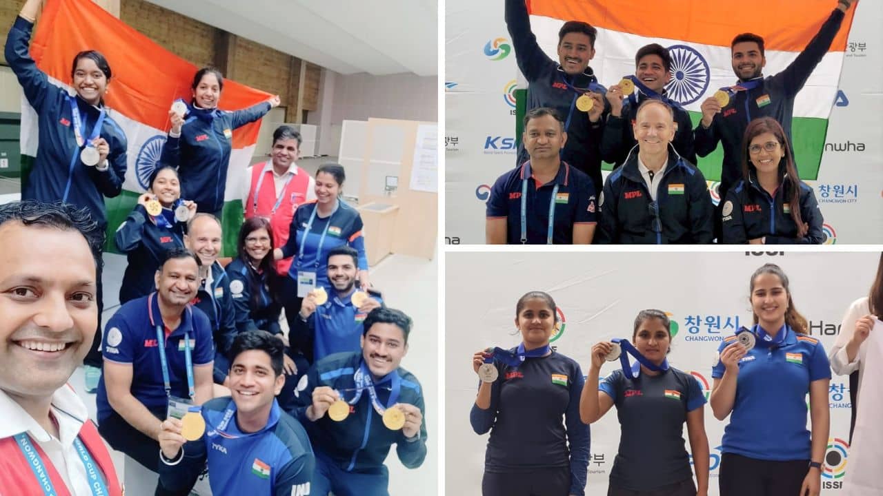 ১০ মিটার এয়ার রাইফেলের দলগত ইভেন্টে সোনা ও রুপো পাওয়ার পাশাপাশি, ভারতীয় শুটাররা ১০ মিটার এয়ার পিস্তল ইভেন্টের দলগত বিভাগে জোড়া রুপো পেয়েছে। সব মিলিয়ে শুটিং বিশ্বকাপে ভারতের পদকসংখ্যা গিয়ে দাঁড়াল ৮টি। যার মধ্যে রয়েছে ৩টি সোনা, ৪টি রুপো ও ১টি ব্রোঞ্জ। (ছবি-সাই মিডিয়া টুইটার)