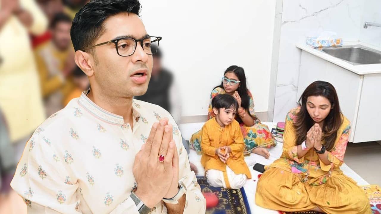 পুজোয় যোগ দিতে দেখা যায় অভিষেকের অফিসের কর্মীদেরও। সঙ্গে ছিলেন অভিষেকের ছেলে, মেয়ে, স্ত্রী, মা, বাবাও।