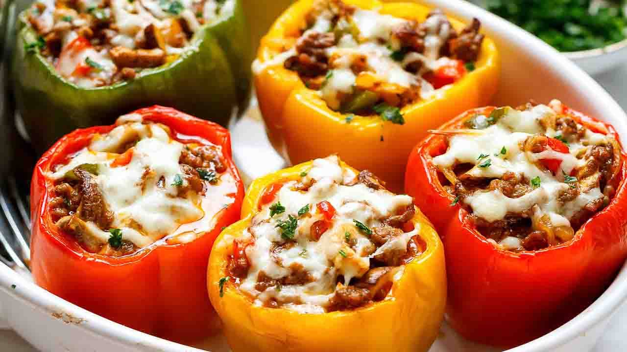 প্রথমে আভেন ২০০ ডিগ্রি সেন্টিগ্রেডে প্রিহিট করে রাখুন। এবার সবুজ, লাল ও হলুদ রঙের ক্যাপসিকামগুলির মাথাটা কেটে নিন। ভিতরের বীজগুলি আলাদা করে রেখে দিন। ক্যাপসিকামের ভিতরে ও বাইরে তেল দিয়ে ব্রাশ করে নিন।
