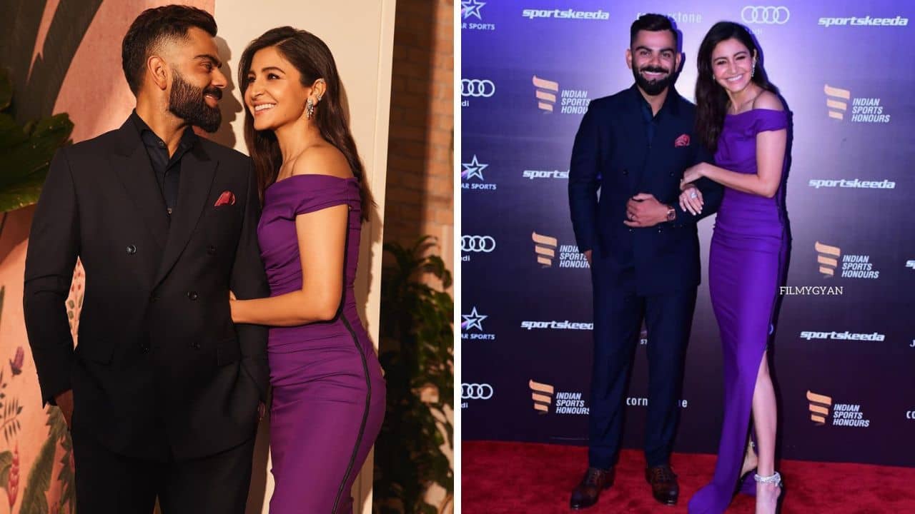 মুম্বইতে হওয়া ইন্ডিয়ান স্পোর্টস অনার্স অনুষ্ঠানে পাপারাজ্জিদের আবদারে পোজ দিয়েছেন বিরাট ও অনুষ্কা। (ছবি-টুইটার)