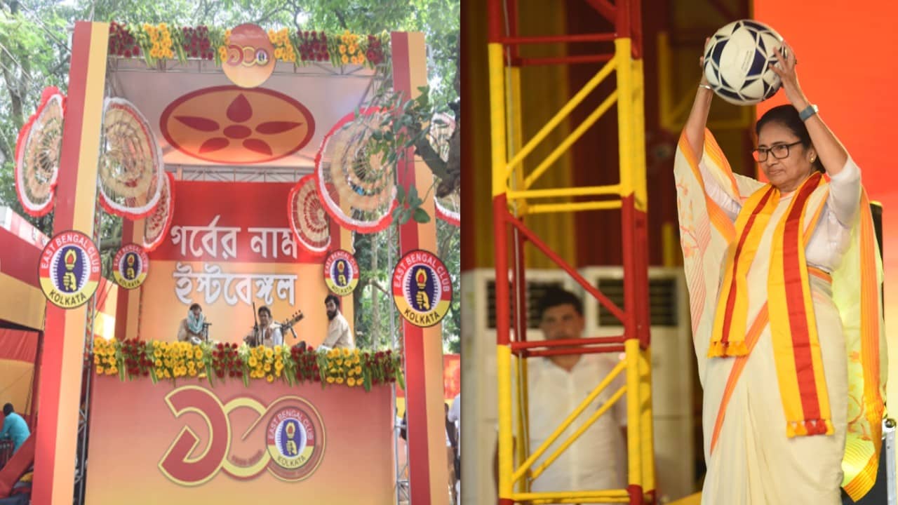 ইস্টবেঙ্গল ক্লাবের পক্ষ থেকে এই অনুষ্ঠানে মুখ্যমন্ত্রীকে ‘দিদি ১০০’ লেখা বিশেষ জার্সি তুলে দেওয়া হয়। (ছবি : ইস্টবেঙ্গল ক্লাবের সৌজন্যে)