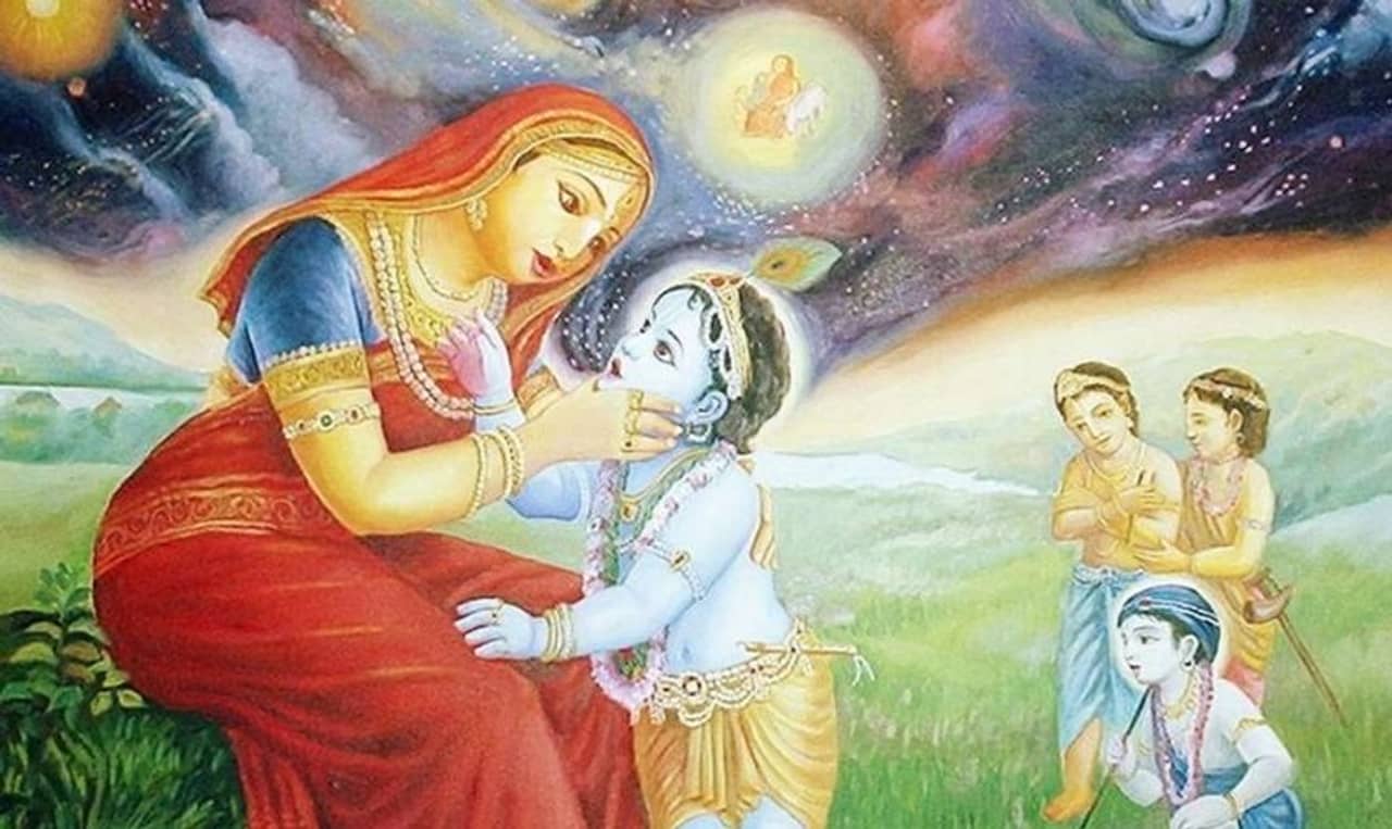 কানহাইয়া উত্তর দেন- “না মাইয়া! আমি মাটি খাইনি।” যশোদা মাইয়া বলেন- কানহাইয়া! “তোমার মুখ খোলো.” মাতা যশোদা যখন ভগবান শ্রীকৃষ্ণের মুখ দেখেনষ আর সেখানে ঘটে যায় এখ অলৌকিক ঘটনা। কানহাইয়ার মুখে তখন ব্রহ্মাণ্ড, ব্রহ্মা, বিষ্ণু, মহেশ এবং সমস্ত কিছু দৃশ্যমান দেখতে পান তিনি।একবারে সমগ্র মহাবিশ্বের দর্শন পেয়েছিলেন মা যশোদা।