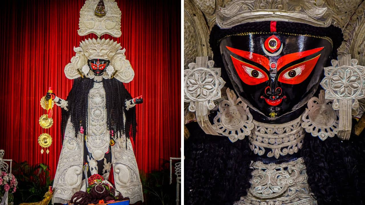 কথিত আছে, স্থানীয় এক কাপালিক দুই ব্রাহ্মণের সাহায্য নিয়ে এই কালীপুজো শুরু করেছিলেন। তবে সেখানে দেবীমূর্তি সব জায়গার থেকে আলাদা। মা এখানে নন চতুর্ভূজা, মায়ের এখানে ২টি হাত। সেইসঙ্গে এখানে মা কালীর জিভ বের করা অবস্থায় নেই। বরং মায়ের জিভ রয়েছে মুখের ভেতর। ১৫৫ বছরের পুরনো পুজোতে এখনও সেই ধারা বজায় রয়েছে।