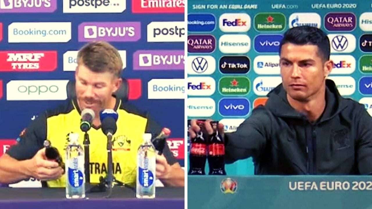 David Warner tries to do a Cristiano Ronaldo at presser, told to put Coca Cola bottles back