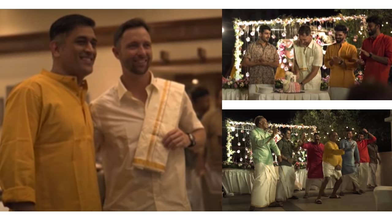দক্ষিণী সাজে সাদা ধুতি-কুর্তা পরেছিলেন কনওয়ে। হলুদ কুর্তা-সাদা ধুতিতে নজর কেড়েছেন ইয়েলোব্রিগেডের নয়নের মনি মহেন্দ্র সিং ধোনি। কনওয়ের প্রি-ওয়েডিং পার্টিতে কিম ওয়াটসন ও কনওয়ের উদ্দেশ্যে ছোট্ট বার্তা দেন সিএসকে কোচ ফ্লেমিং। এরপর কেক কাটেন কনওয়ে। ক্ষণিকের মধ্যে সেই কেক দেখা যায় কনওয়ের মুখ জুড়ে। সতীর্থরা তাঁর বিয়ের পার্টিতে বেশ মজা করেছেন যা সিএসকের শেয়ার করা ভিডিও দেখে বোঝা যায়।