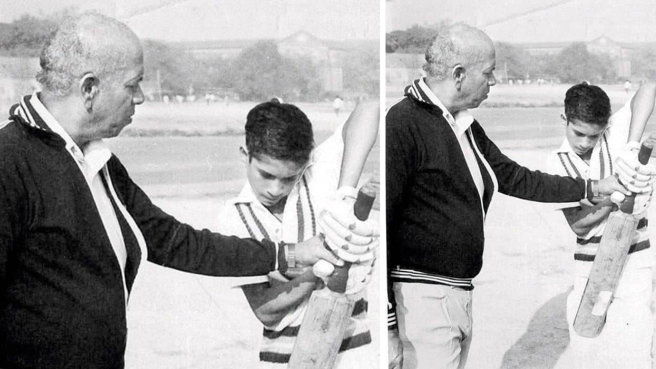 ছোট্ট সচিনের হাতে ব্যাট। আচরেকর স্যার শিষ্যকে শেখাচ্ছেন টেকনিক। এই ছবির ক্যাপশনে সচিন লিখেছেন, 'যে মানুষটার কাছে আমি ক্রিকেটার হয়েছি! তিনি আমাকে যে শিক্ষা দিয়েছেন তা আমার সঙ্গে সারাজীবন রয়েছে। আপনার জন্মবার্ষিকীতে আপনাকে আরও বেশি স্মরণ করি। আপনি আমার জন্য যা কিছু করেছেন তার জন্য আপনাকে অনেক ধন্যবাদ আচরেকর স্যার।' (ছবি-সোশ্যাল মিডিয়া সাইট X)