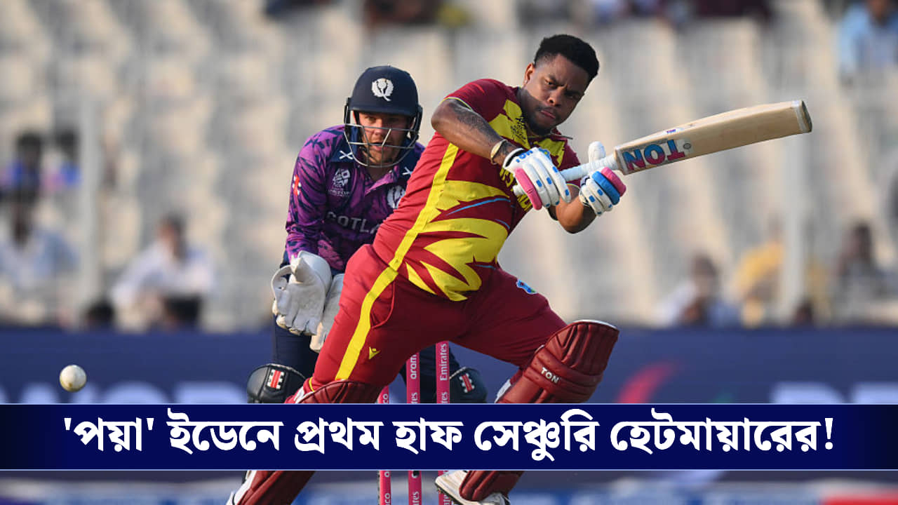 ছয় মেরে হাফ সেঞ্চুরির গণ্ডি ছুঁতেই আকাশের দিকে একবার তাকালেন। তারপর সেই উল্টো ব্যাট ধরে চিরাচরিত সেলিব্রেশন। গ্ৰুপ ‘সি’ এর প্রথম ম্যাচে স্কটল্যান্ডের বিরুদ্ধে মাত্র ২২ বলে ৫০ করলেন ওয়েস্ট ইন্ডিজ দলের অন্যতম প্রতিশ্রুতিমান ব্যাটার শিমরন হেটমায়ার। বাউন্ডারি মেরেছেন মাত্র দু’টো। ছ’টা বিশাল ছক্কা গ্যালারিতে সফল ল্যান্ডিং করেছে। স্ট্রাইক রেট ১৭৭.৭৭। যতক্ষণ তিনি ক্রিজে ছিলেন, আশা করা যাচ্ছিল হয়ত সহজেই ২০০ রানের গণ্ডি পার করে ফেলবে দুই বারের বিশ্ব চ্যাম্পিয়নরা।