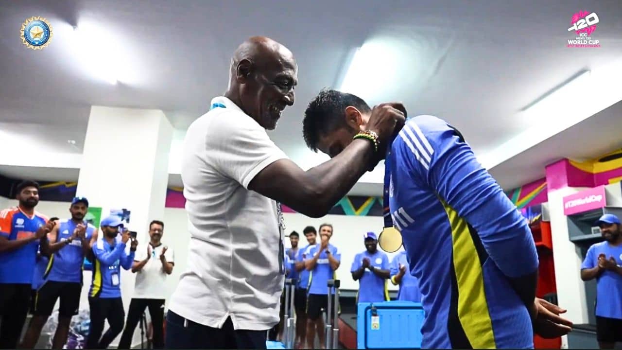 বিসিসিআই প্রথা মেনে এ বারের টি-২০ বিশ্বকাপের প্রতি ম্যাচের শেষে সেরা ফিল্ডার মেডেল দিচ্ছে ভারতীয় ক্রিকেটারদের। এবং সেই সেরা ফিল্ডার মেডেল বিতরণের ভিডিয়ো শেয়ার করা হয়েছে বোর্ডের সোশ্যাল মিডিয়া সাইট X এ। সেরা ফিল্ডারের পুরস্কার দিতে ভিভিয়ান রিচার্ডস ভারতের ড্রেসিংরুমে আসছেন শোনার পর প্রত্যেকেই উঠে দাঁড়ান। এবং হাততালিতে ভরে যায়। স্যার ভিভ রিচার্ডস ড্রেসিংরুমে ঢুকে প্রথমেই বিরাট কোহলির সঙ্গে হাত মেলান। এরপর ভারতের ফিল্ডিং কোচ টি দিলীপ জানান, ভারত-বাংলাদেশ ম্যাচের সেরা ফিল্ডারের পুরস্কার পেয়েছেন সূর্যকুমার যাদব। এরপর ভিভ স্কাইয়ের গলায় ওই মেডেল পরিয়ে দেন।