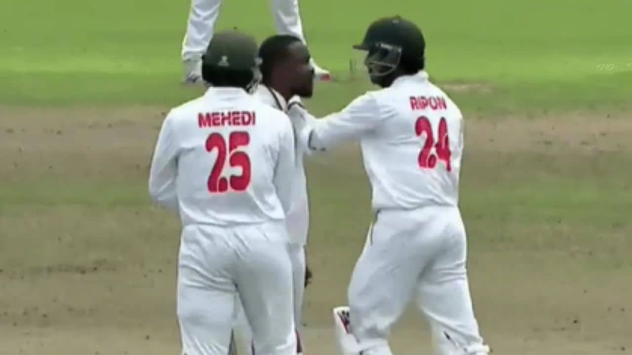 কী ঘটেছে? ঢাকায় ছিল বাংলাদেশ-দক্ষিণ আফ্রিকার চার দিনের টেস্ট ম্যাচ। তৃতীয় দিন ঘটেছে এই কলঙ্কিত ঘটনা। ১০৫তম ওভারে বল করছিলেন প্রোটিয়াদের শেপো এনটুলি। রিপন মণ্ডল তাঁকে প্রথম বলেই ছয় মারেন। তারপরই দুই ক্রিকেটারকে বাগবিতণ্ডায় জড়াতে দেখা যায়। যে ভিডিয়ো ভাইরাল হয়েছে, তাতে দেখা যাচ্ছে, এনটুলি প্রথম ঠেলা দেন রিপনকে। এনটুলি এতেই থামেননি। রিপনের হেলমেট ধরে টানতে শুরু করেন। তাঁকে সেই সময় ছাড়ানো যাচ্ছিল না। পরিস্থিতি আয়ত্তের বাইরে চলে যেতে দেখে আম্পায়ার সঙ্গে সঙ্গে আসরে নামেন। তাতেও প্রথম শান্ত করা যায়নি দুই ক্রিকেটারকে।