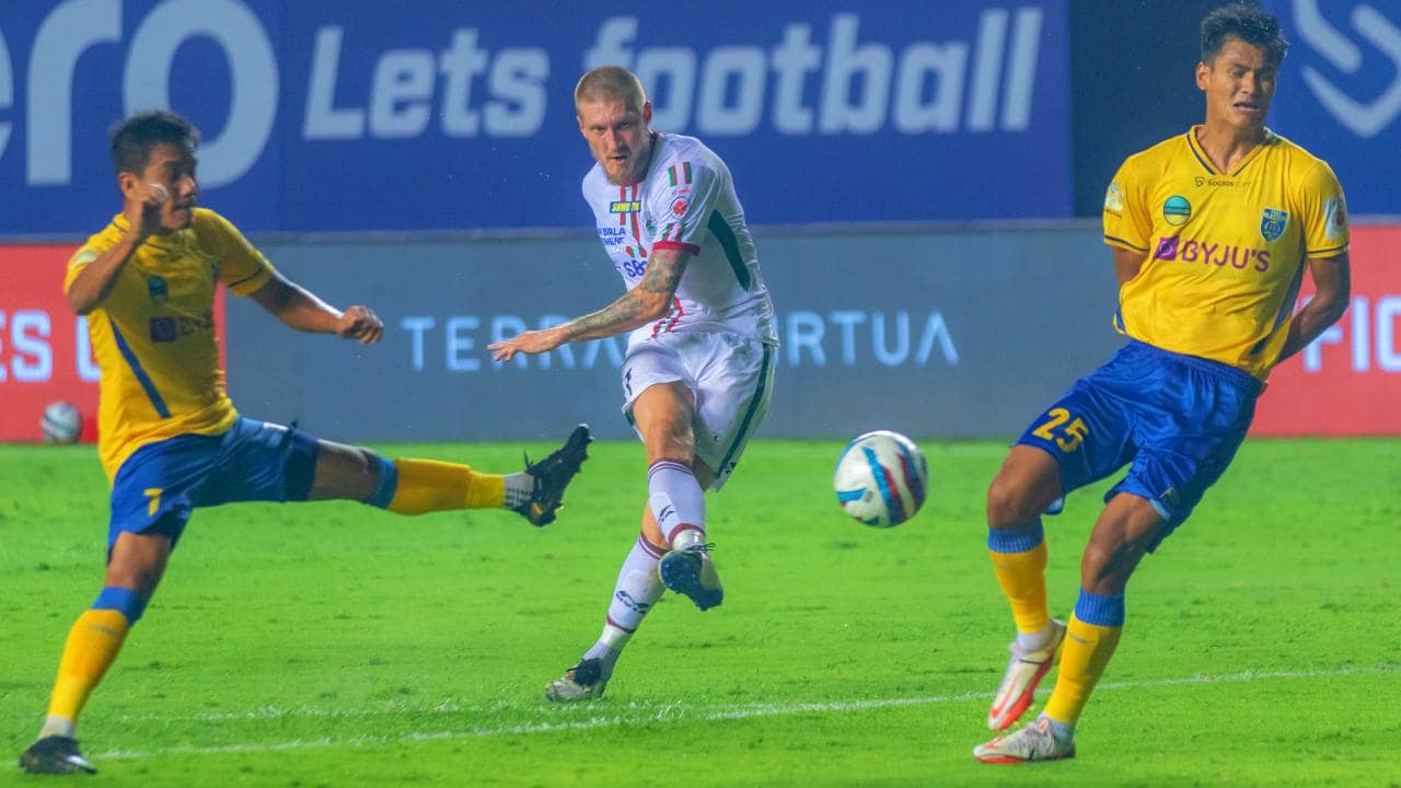 গোয়া: এটিকে মোহনবাগান (ATK Mohun Bagan) ও কেরালা ব্লাস্টার্স এফসি (Kerala Blasters FC) ম্যাচটাকে ঘিরে টানটান উত্তেজনা ছিল। কেরালার বিরুদ্ধে হারতে বসা ম্যাচে শেষ অবধি জনি কাউকোর গোলে পয়েন্ট ভাগাভাগি করে মাঠ ছাড়েন রয় কৃষ্ণারা। পুরো তিন পয়েন্ট না পাওয়ায় একদিকে হতাশ হলেও, অন্যদিকে এক পয়েন্ট নিয়ে মাঠ ছাড়তে পারায় খুশি বাগান কোচ হুয়ান ফেরান্দো (Juan Ferrando)। ম্যাচের শুরুতেই ৭ মিনিটে ডান পায়ের ফ্রি কিকে গোল করেন আদ্রিয়ান লুনা। পিছিয়ে গেলেও ঠিক এক মিনিটেই ম্যাচে ফিরে আসে মোহনবাগান। প্রীতম কোটালের পাস থেকে ৮ মিনিটের মাথায় দুরন্ত গোল করে সমতা ফেরান ডেভিড উইলিয়ামস। বাগান গোলকিপার বেশ কয়েকটা গোল বাঁচালেও তাঁর বেশ কিছু ভুল এ দিন চোখে পড়ে। ম্যাচের ৬৪ মিনিটে ফের লুনার দৌলতে এগিয়ে যায় কেরল। বেশ কয়েকটা পরিবর্তন করেন বাগান কোচ। একে ২-১ পিছিয়ে, তার ওপর ৯০+২ মিনিটের মাথায় লাল কার্ড দেখেন মোহনবাগানের প্রবীর দাস। ১০ জনের সবুজ-মেরুন তাও আশা ছাড়েনি। আর তাই আগ্রাসী বাগানকে আকটাতে পারেনি কেরালা। সংযুক্ত সময়ে (৯০+৭মিনিটে) এটিকে মোহনবাগানের হয়ে সমতা ফেরানোর গোলটি করেন জনি কাউকো। সংযুক্ত সময়ের শেষের দিকে কেরালার হয়ে লাল কার্ড দেখেন জর্জ পেরেইরা দিয়াজ।