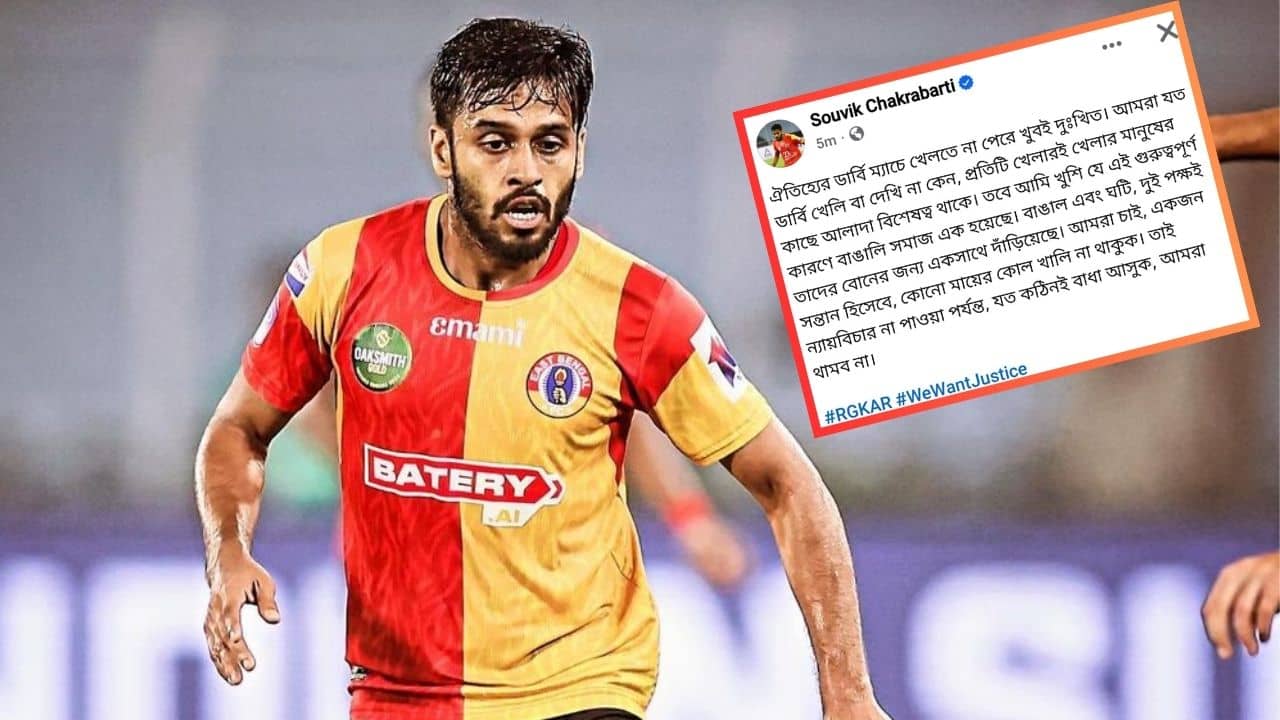 সৌভিক ফেসবুকে লিখেছিলেন, ‘ঐতিহ্যের ডার্বি ম্যাচে খেলতে না পেরে খুবই দুঃখিত। আমরা যত ডার্বি খেলি বা দেখি না কেন, প্রতিটি খেলারই খেলার মানুষের কাছে আলাদা বিশেষত্ব থাকে। তবে আমি খুশি যে এই গুরুত্বপূর্ণ কারণে বাঙালি সমাজ এক হয়েছে। বাঙাল এবং ঘটি, দুই পক্ষই তাদের বোনের জন্য একসাথে দাঁড়িয়েছে। আমরা চাই, একজন সন্তান হিসেবে, কোনো মায়ের কোল খালি না থাকুক। তাই ন্যায়বিচার না পাওয়া পর্যন্ত যত কঠিনই বাধা আসুক, আমরা থামব না। #RGKAR #WeWantJustice’