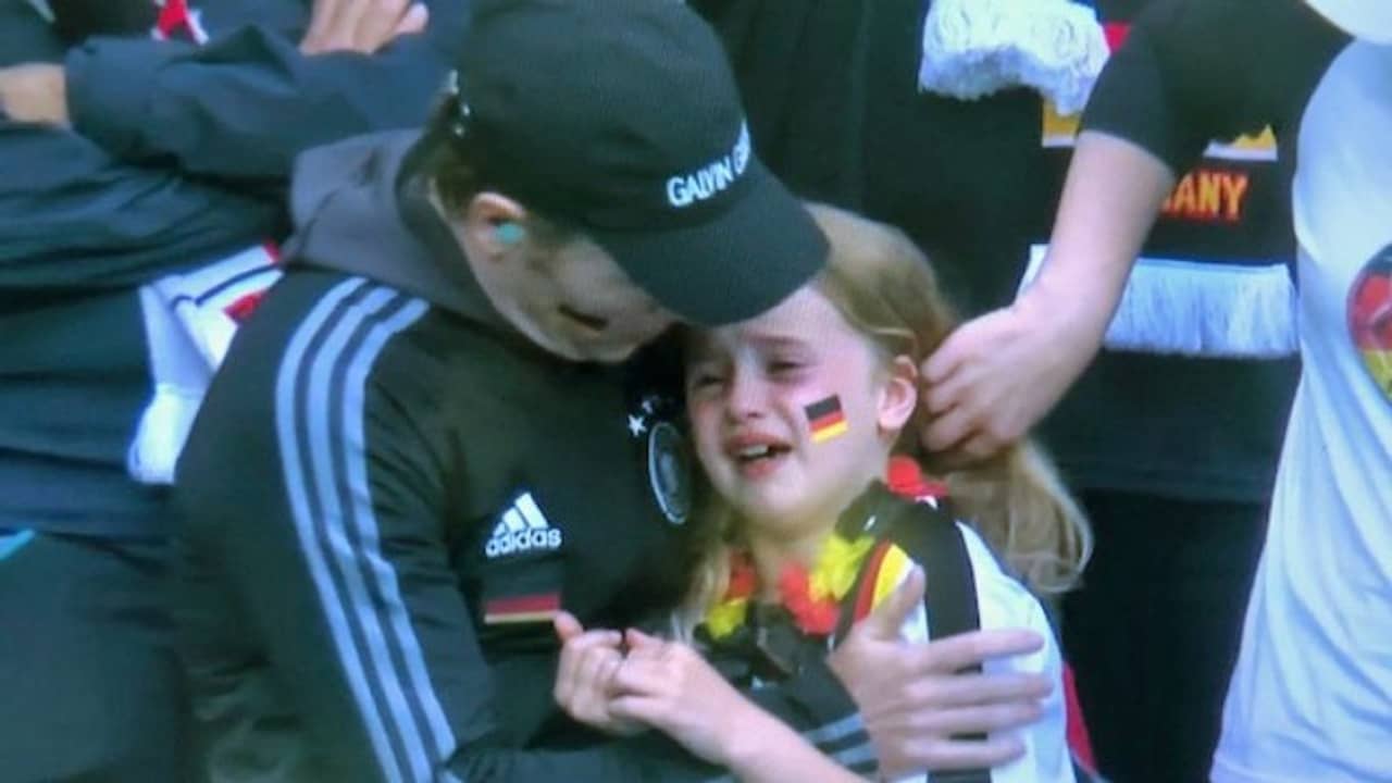 লন্ডনঃ হার তখন শুধু সময়ের অপেক্ষা।২-০ গোলে পিছিয়ে জার্মানি(GERMANY)। ম্যাচের ভবিতব্য বুঝে গিয়েছে গোটা দুনিয়া।ইউরোতে (EURO 2021) ইতিহাস গড়ছে ইংল্যান্ড(ENGLAND)। ম্যাচের ইনজুরি টাইমে টমাস মুলারকে(THOMAS MULLER) যখন তুলে পরিবর্ত নামানো হচ্ছে, তখনই স্টেডিয়ামের জায়ান্ট স্ক্রিনে ধরা পড়ল সেই মন খারাপের ছবি। একরত্তি জার্মান সমর্থক(GERMAN FAN GIRL) কেঁদে চলেছেন অনর্গল। প্রিয় দলের হারের ধাক্কা যে শিশু মনটাকে তছনছ করে দিয়েছে। আর তাকে স্বান্তনা দিচ্ছেন তার বাবা। মুহুর্তে ভাইরাল হয়ে যায় ছবি।