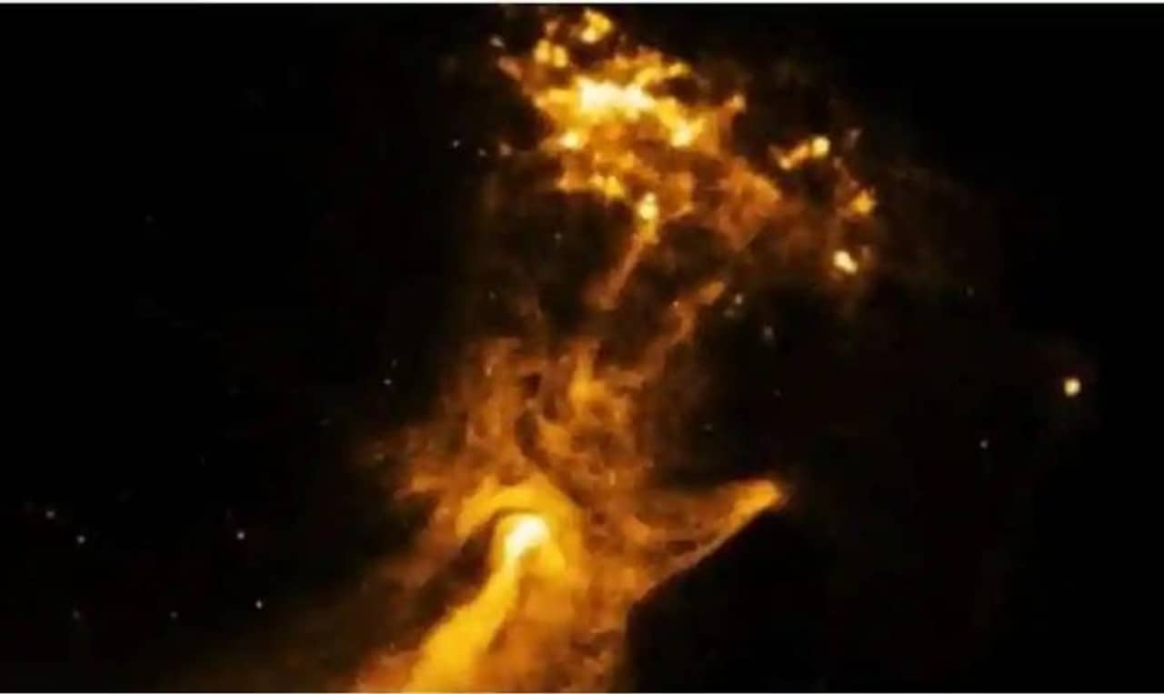 মহাকাশের গভীর নিকষ কালো রঙের পটভূমিতে একটি সোনালী রঙের রূপরেখা দেখা গিয়েছে, যেটি দেখলে চোখের সামনে একটি হাতের মতো দেখতে লাগবে বিস্ময়কর এই রূপরেখাকেই ভগবানের হাত বলে উল্লেখ করা হয়েছে। মনে হবে, একটি ফাঁকা জায়গা থেকে হাত একটি হাতের সদৃশ হাত বেড়িয়ে আসছে, মনে হবে কেউ একজন আর্শীবাদ করার জন্য হাতটি বাড়িয়ে দিয়েছেন। ছবিটি দেখলেই বুঝবেন মহাকাশেও কী আশ্চর্য সুন্দর ঘটনা ঘটেছে।