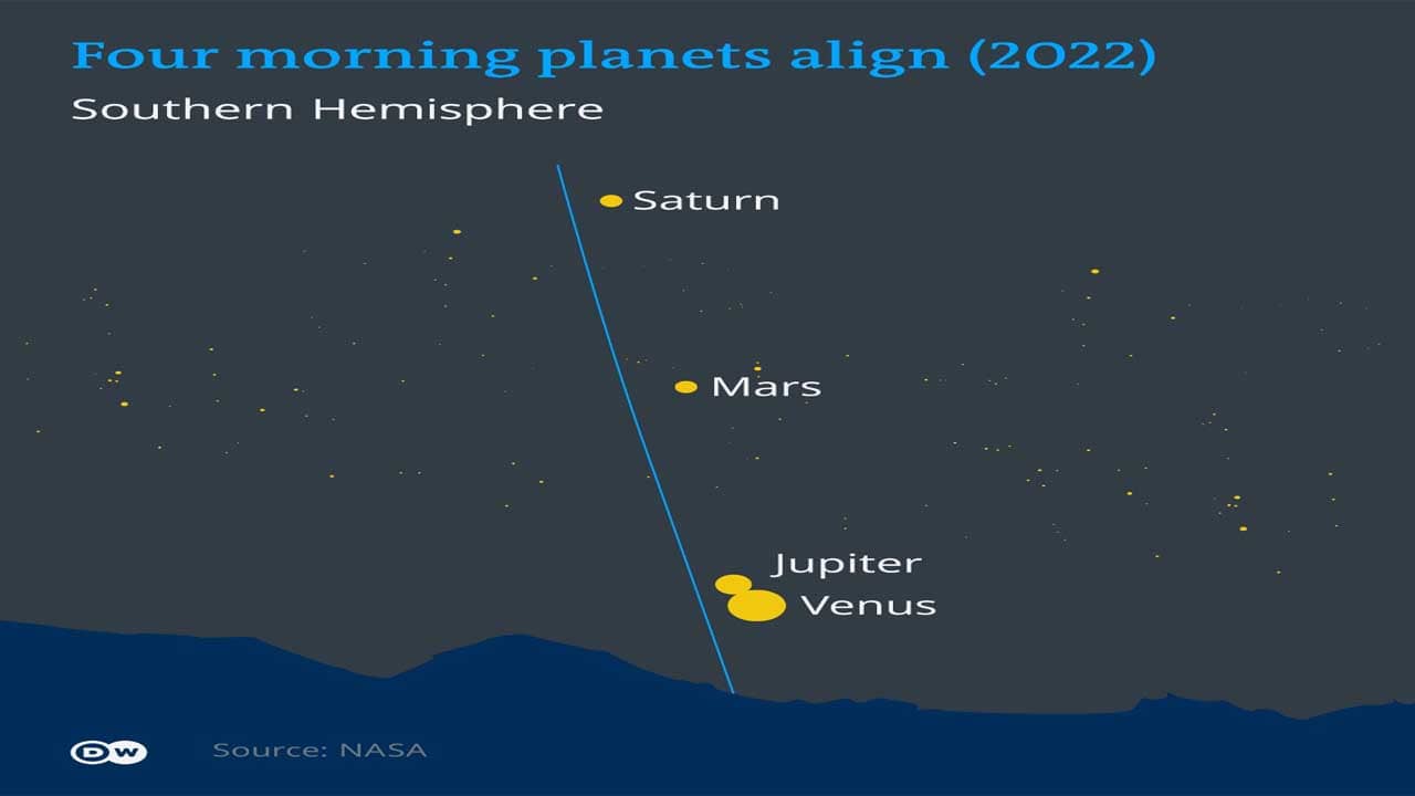 গ্রহ, নক্ষত্ররা অনেকসময়েই এক সরলরেখায় অবস্থান করে (Planetary Conjunction)। তবে চলতি বছরের এপ্রিল মাসে একদম অন্য ধরনের বিষয় চাক্ষুষ করা সম্ভব। সৌর মণ্ডলে (Solar System) পৃথিবীর সবচেয়ে কাছে থাকা চার প্রতিবেশী গ্রহ শুক্র, মঙ্গল, বৃহস্পতি এবং শনি প্রায় নিখুঁতভাবে সারিবদ্দ হবে। জ্যোতির্বিজ্ঞানীরা বলছেন, প্রায় এক সরলরেখায় অবস্থান করবে এই চারটি গ্রহ। টেলিস্কোপ ছাড়াই সাদা চোখে দেখা যাবে এই অ্যালাইনমেন্ট অর্থাৎ চারটি গ্রহের সারিবদ্ধ অবস্থান। ৩০ এপ্রিল থেকে ১ মে- র মধ্যে সকালবেলায় এই দৃশ্য লক্ষ্য করা যাবে। তবে এই অবস্থানের সবচেয়ে চমৎকার জিনিস হল যখন শুক্র এবং বৃহস্পতি গ্রহ একই সরলরেখায় অবস্থান করবে তখন এই দুই গ্রহের একে অন্যের সঙ্গে সংঘর্ষ হবে। একে বলা হয় একটি আলট্রাক্লোজ কনজাংশন। তবে এর মধ্যেও রয়েছে একটি চমক।