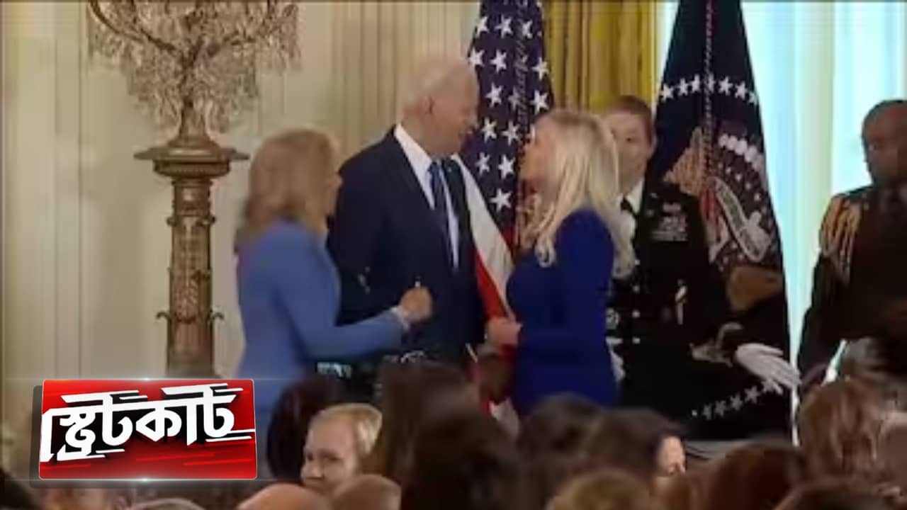 ভিডিয়োটা গতকাল সামনে আসতেই মুহূর্তে ভাইরাল। কোটি কোটি আমেরিকান এটা দেখে ফেলেছেন। ডেমোক্র্যাটরা পড়েছেন চরম অস্বস্তিতে। হোয়াইট হাউসে একটা অনুষ্ঠান ছিল। গাঢ় নীল রঙের পোশাকে সোনালী চুলের যে মহিলাকে দেখছেন, তিনি সেখানে আমন্ত্রিত ছিলেন। আর হালকা নীল রঙের পোশাকে সোনালী চুলের মহিলা জো বাইডেনের স্ত্রী জিল বাইডেন।