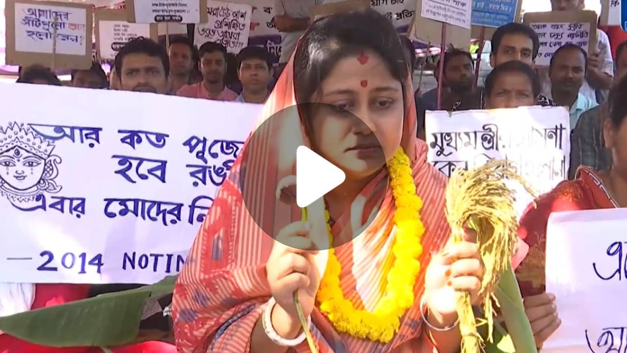 ধর্মতলায় ধর্নামঞ্চে হচ্ছে প্রতীকী প্রতিবাদ। একজন চাকরিপ্রার্থী ধর্নামঞ্চে বসেছেন লক্ষ্মী সেজে। সঙ্গে আরও এক চাকরিপ্রার্থী সেজেছেন পুরোহিত। লক্ষ্মীর পাশে যিনি বসে রয়েছে তাঁর হাতে লেখা, “এসো মা লক্ষ্মী বসো আমাদের ধর্নামঞ্চে”। ধর্নামঞ্চের লক্ষ্মীর বাড়িতে রয়েছে তাঁর সন্তান। তাঁকে ছেড়ে এসে তিনি বসেছেন অবস্থান বিক্ষোভে। “আমরা আর কতদিন রাস্তায় পড়ে থাকব। পাশেই কালকে কার্নিভালের জন্য এত আনন্দ, কিন্তু আমাদের ধর্নামঞ্চটাকে সাদা কাপড়ে ঢেকে দেওয়া হয়েছে”, বলছেন তিনি। কাপড়ে মুড়ে দিলেই কি সব কিছু ঢাকা পড়ে যাবে, প্রশ্ন তাঁর। তিনি আরও বলেন, “এত দুর্নীতি, যে দুর্নীতির ভারে আমরা চাপা পড়ে গেছি। আমাদের সকলের নিয়োগ না হলে আমরা ধর্নামঞ্চ থেকে উঠছি না”।
