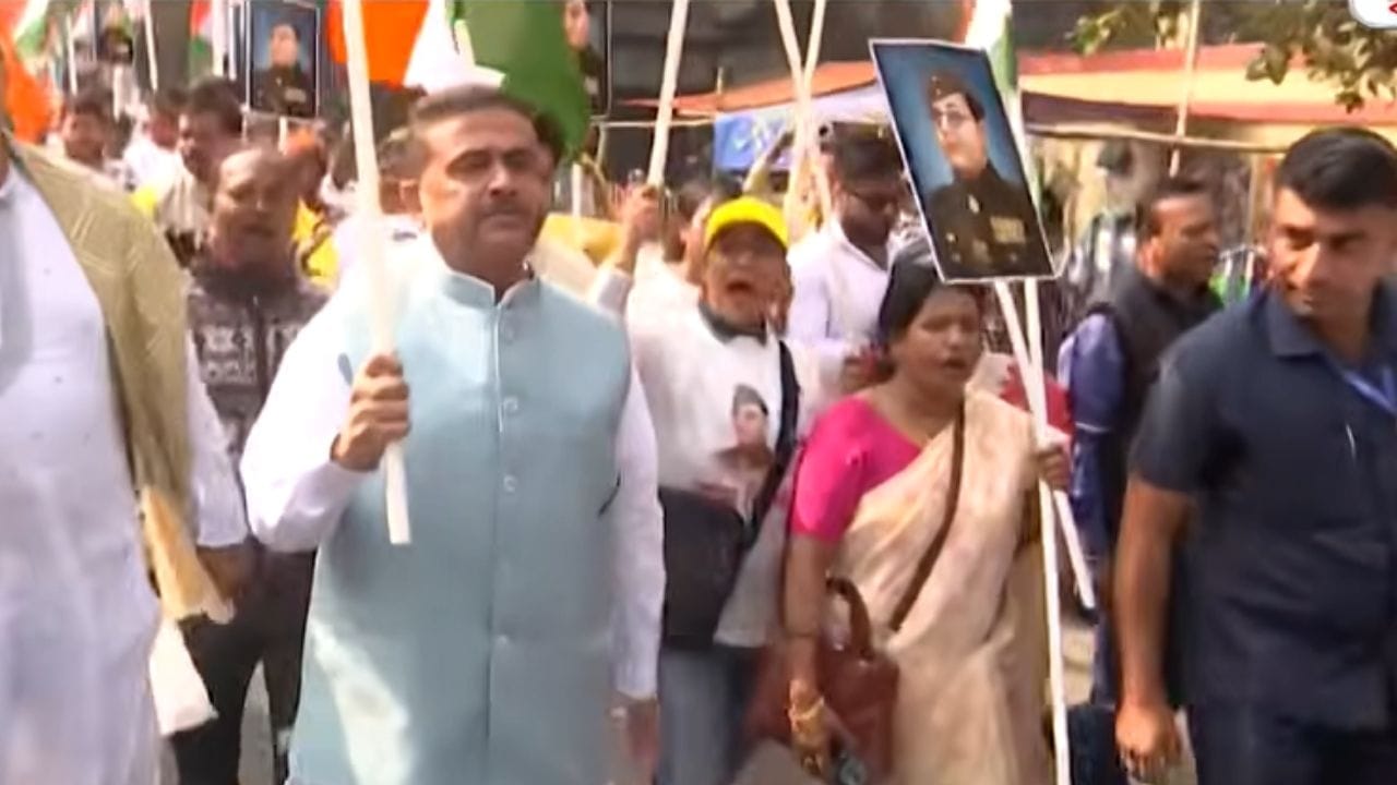 Suvendu Adhikari: নেতাজির ১২৯ তম জন্মবার্ষিকীতে ভবানীপুরে বিজেপি নেতা শুভেন্দু অধিকারী। শ্যামাপ্রসাদ মুখোপাধ্যায়ের বাড়ি থেকে নেতাজি সুভাষ চন্দ্র বসুর বাড়ি পর্যন্ত মিছিল করেন বিরোধী দলনেতা। তিনি বলেন, "আজ ভবানীপুরে ৩৬ টি নিমন্ত্রণ পেয়েছি। আমি যতক্ষণ থাকবো উনি (মমতা বন্দ্যোপাধ্যায়) ভাববেন"।