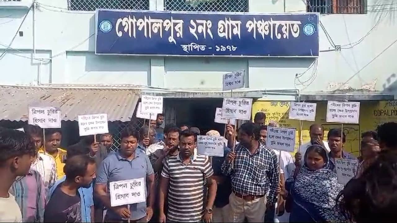 পরিস্থিতি নিয়ন্ত্রণে আনতে হস্তক্ষেপ অঞ্চল সভাপতির। বসিরহাটের সুন্দরবনের হাড়োয়া ব্লকের গোপালপুর ২নং গ্রাম পঞ্চায়েতের ঘটনা। উপপ্রধান মাসিদা বিবি ও তার স্বামী যুব তৃণমূল কংগ্রেসের সভাপতি কামরুল সরদারের বিরুদ্ধে পঞ্চায়েত অফিস থেকে কয়েকশো ত্রিপল চুরি এবং বিক্রি করে দেওয়ার অভিযোগ তুলে তার বিরুদ্ধে প্রতিবাদ ও বিক্ষোভে সামিল হন পঞ্চায়েতের অন্যান্য সদস্যরা। সুন্দরবন এলাকায় রাজ্য সরকারের বিপর্যয় মোকাবেলা দপ্তরের দেওয়া ত্রিপল বণ্টনেও অনিয়ম করেছেন উপপ্রধান। এই অভিযোগ তুলে গোপালপুর ২নং গ্রাম পঞ্চায়েতের ১৪ জন তৃণমূলের জয়ী সদস্যরা তৃণমূলের গোপালপুর ২নং অঞ্চল সভাপতি বাগবুল কালাম মুন্সীর নেতৃত্বে পঞ্চায়েতের সামনে বিক্ষোভ দেখান। এমনকি পঞ্চায়েতের মূল গেটে তালাও লাগিয়ে দেন তারা।