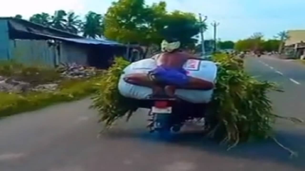 ভাইরাল হওয়া এই ভিডিয়োটি একটি গ্রামের বলেই মনে হচ্ছে, যেখানে একজন কৃষক একটি বাইকে প্রচুর ঘাস, পাতা গাছের ডাল রেখে বাইক চালাচ্ছেন। সোশ্যাল মিডিয়ায় এই কৃষকের ড্রাইভিং-এর প্রশংসা করছেন মানুষ। ভিডিয়োয় দেখা যাচ্ছে, এক কৃষক কোনওভাবে পিছনে বসে ট্যাঙ্কে এবং পুরো সিটে ঘাস রেখে বাইক চালাচ্ছেন। আর সেই বস্তার উপর থেকেই হাত দিয়ে কোনও রকমে বাইকের হ্যাল্ডেল দু’টি ধরেছেন। চালক হাসিমুখে আর কোন টেনশন ছাড়াই বাইক চালাচ্ছেন। পাশ দিয়ে অন্য এক ব্যক্তি যাওয়ার সময় এই ভিডিয়োটি করেছেন।