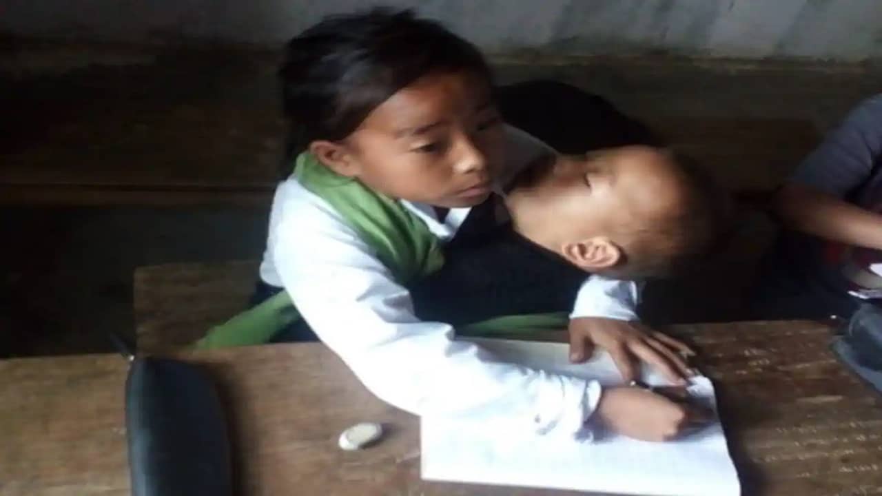This 10-year-old girl named Meiningsinliu Pamei from Tamenglong, Manipur attends school babysitting her sister, as her parents were out for farming & studies while keeping her younger sister in her lap. pic.twitter.com/OUIwQ6fUQR