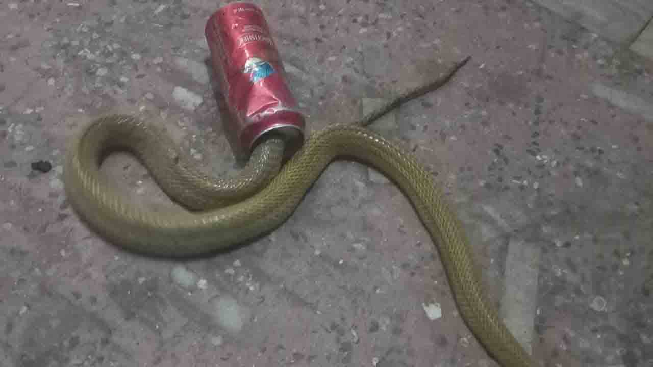 ইউটিউবে ব্যাপক ভাইরাল হয়েছে সেই ভিডিয়োটি। ৪ ফুট লম্বা একটি সাপের মাথা ঢুকে গিয়েছিল বিয়ার ক্যানের ভিতরে। দীর্ঘ ক্ষণ ছটফট করতে থাকে সে। পুরী থেকে অনতিদূরে মাধিপুর গ্রামের ঘটনা। শেষমেশ গ্রামবাসীদের আপ্রাণ চেষ্টায় প্রাণ বাঁচে সেই সাপের। এমনকি ফেলে দেওয়া বিয়ার ক্যানের ভিতরে কেউটে সাপের মাথা পুরোপুরি আটকে যাওয়ায় ঘটনাস্থলে ডেকে নিয়ে আসা হয় বনকর্মীদেরও। পরবর্তীতে একজন বনকর্মী সাপ ধরার ধাতব যন্ত্র দিয়ে উদ্ধার করেন।