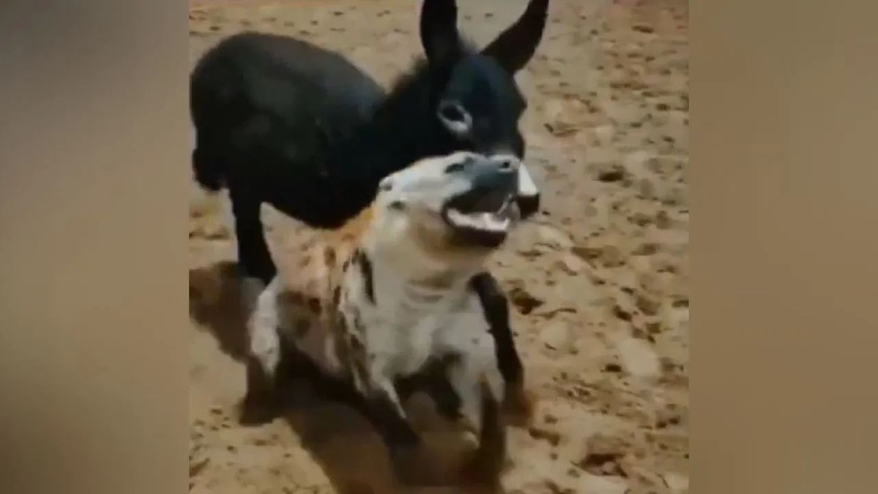সোশ্যাল মিডিয়ায় ভাইরাল হওয়া ভিডিয়োয় দেখা যাচ্ছে, একটি হায়েনা গাধার সঙ্গে লড়াই করে পারছে না। গাধাটি দাঁত দিয়ে হায়নার কান চেপে ধরেছে এবং এত শক্ত করে ধরে রেখেছে যে হায়না তা চেষ্টা করেও ছাড়াতে পারছে না। কেবল চিৎকার করেই চলেছে, কিন্তু গাধাটি তার কান ছাড়ছে না। কয়েক সেকেন্ড পরে, হায়েনা নিজেকে বাঁচাতেপারে এবং গাধার খপ্পর থেকে মুক্ত হতেই সঙ্গে সঙ্গে সেখান থেকে দৌড়ে পালিয়ে যায়।