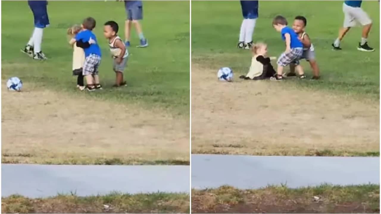 সদ্য ভাইরাল হওয়া এই ভিডিয়োটি জুলাই মাসের শেষ দিকে ইনস্টাগ্রামে শেয়ার করেছিলেন জেনিফার বারবার নামের এক মহিলা। ছোট্ট এই ভিডিয়োতে দেখা গিয়েছে, বান্ধবীর কাছাকাছি আসতে দুই বন্ধুর মিষ্টি লড়াই। একজন যখন বান্ধবীর সঙ্গে হাগ করছে, অপরজন তখন পিছন থেকে তাকে ধাক্কা দিচ্ছে। হাগ করতে গিয়ে ছোট্ট মেয়েটি মাটিতে পড়ে যায়। তারপরে দুই বন্ধু মিলেই তাদের বান্ধবীকে টেনে তোলে। কিউট না?