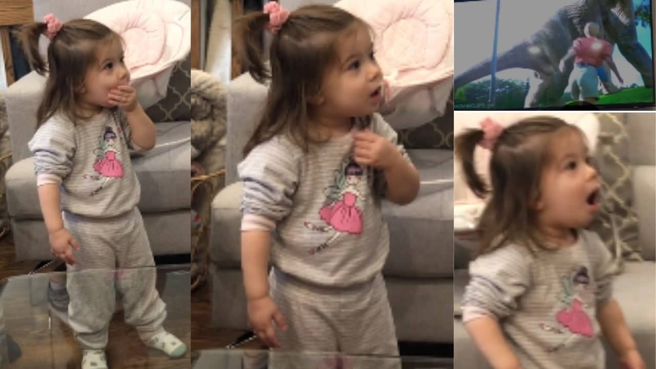 মেয়েটির বয়স মাত্র ২ বছর। আর এই প্রথম তার বাবা তাকে জুরাসিক পার্ক ছবিটি দেখাল। সেখানেই প্রথম বার তার পরিচয় হল একটি ডাইনোসরের সঙ্গে। আর সেই ডাইনোসর দেখার পরে তার সত্যিই চক্ষু চড়কগাছ হয়ে গিয়েছে। আর তার সেই প্রতিক্রিয়া যেন নেটপাড়ার লোকজনের মন জিতে নিয়েছে।