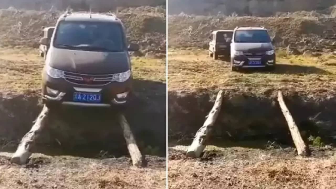 ভিডিয়োতে দেখা গিয়েছে, একটি বড় নালা যার পিছনে রয়েছে দুটি গাড়ি। আর সেই নালাটি না অতিক্রম করলে কোনও ভাবেই সামনের দিকে এগিয়ে যাওয়া যাবে না। নালা পারাপারের জন্য রয়েছে দুটি গাঁছের গুঁড়ি, যার উপর দিয়ে একটা মানুষের হেঁটে যাওয়া কষ্টকর – একটা চারচাকা গাড়ি তো দূরস্ত!