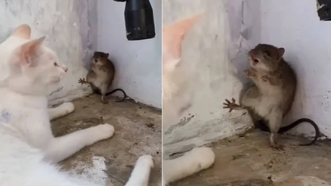 সোশ্যাল মিডিয়ায় ভাইরাল হওয়া এই ভিডিয়োয় দেখা যাচ্ছে, একটি সাদা বিড়াল বসে আছে এবং তার সামনে একটি ইঁদুর ভয়ে দেওয়ালের কোণে লুকিয়ে আছে। তার অভিব্যক্তি দেখে মনে হচ্ছে সে খুব ভয় পেয়েছে এবং চিৎকার করার চেষ্টা করছে। একটি হিংস্র বন্য প্রাণীকে দেখে মানুষ যেভাবে আতঙ্কিত হয়, এই দৃশ্যটি ঠিক সেই রকমই। এই ভাইরাল ভিডিয়োটি কোথাকার, সে সম্পর্কে কোনও তথ্য পাওয়া যায়নি। তবে যে ব্যক্তি এটি সোশ্যাল মিডিয়ায় শেয়ার করেছেন তার প্রোফাইল এবং ভাষা দেখে মনে হচ্ছে এই ভিডিয়োটিমালয়েশিয়া, ইন্দোনেশিয়া, ব্রুনাই বা সিঙ্গাপুরের হতে পারে।
