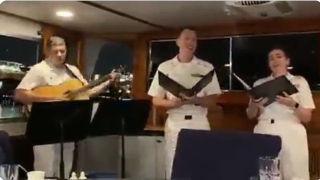 US navy officers sing a Bollywood song at the Secretary of Navy’s dinner on the Potomac river in #WashingtonDC @SandhuTaranjitS@IndianEmbassyUS @USNavy @SECNAV@iamsrk @karanjohar #KalHoNaHo #India #US #Bollywood #Song #Viral pic.twitter.com/VmNuwF57uF