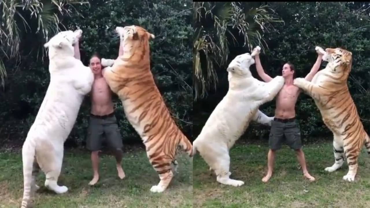 ২৭ সেকেন্ডের এই ভিডিয়ো ২০ ঘণ্টায় ৩ লক্ষ মানুষেরও বেশি মানুষের কাছে পৌঁছে গেছে। অ্যাবসলুট ইউনিট নামক টুইট্যার আকাউন্ট থেকে পোস্ট করা হয়েছে এই ভিডিয়ো। যেখানে দেখা যাচ্ছে একজন লোক দুটি দুধের বোতল নিয়ে দাঁড়িয়ে রয়েছে। দুটি প্রাপ্তবয়স্ক বাঘ আসলো এবং ফিডিং বোতলে দুধ খেতে খেতে তার কাঁধের ওপর উঠে পড়ছে।