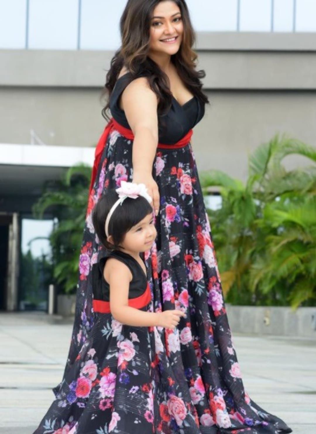 লাল-নীল ফ্লোরাল লং ড্রেস পরিয়েছেন মেয়েকে