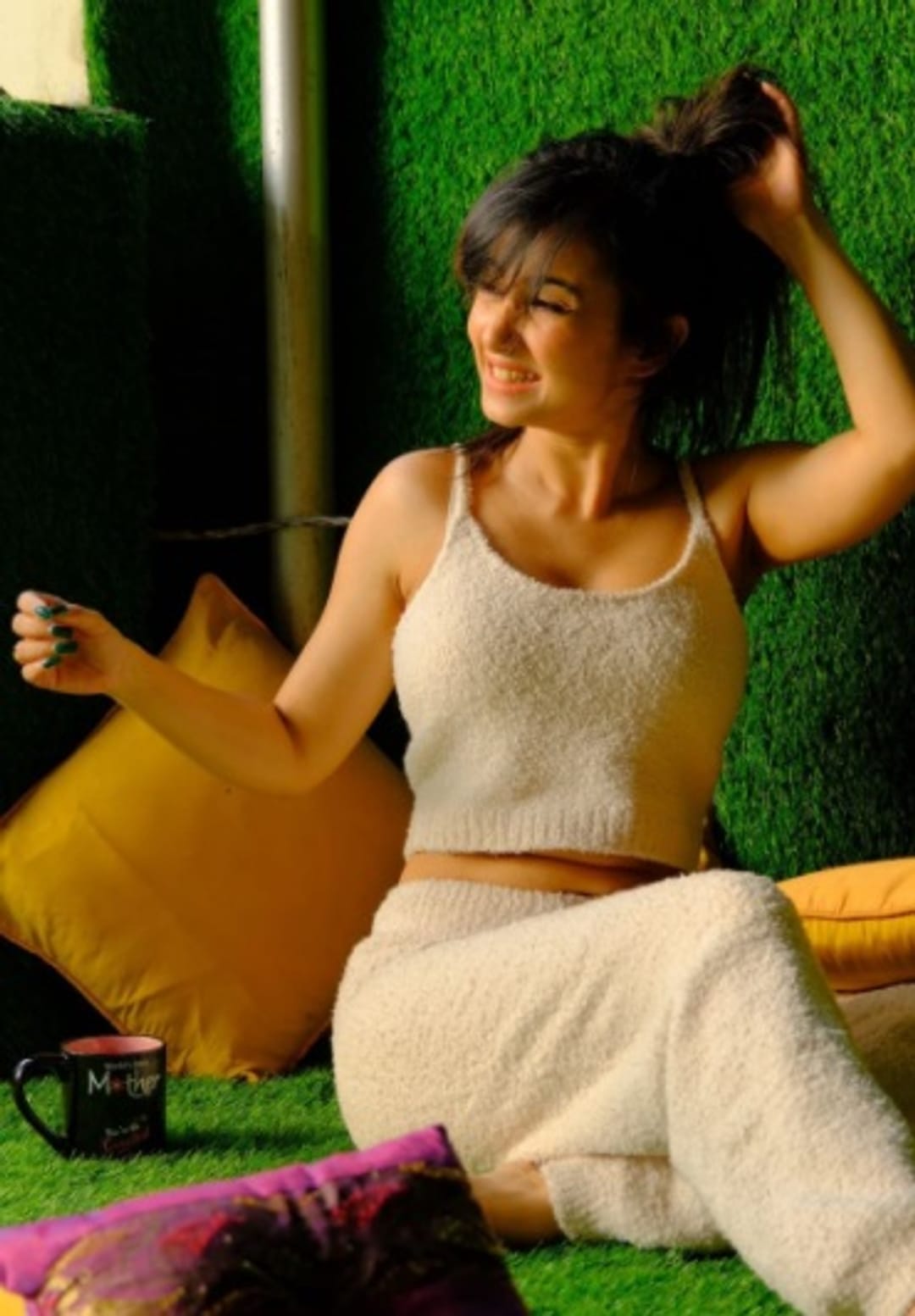 অফ-হোয়াইট উলের প্যান্ট ও স্প্যাগেটি টপের ছবি পোস্ট করেছেন মনামী