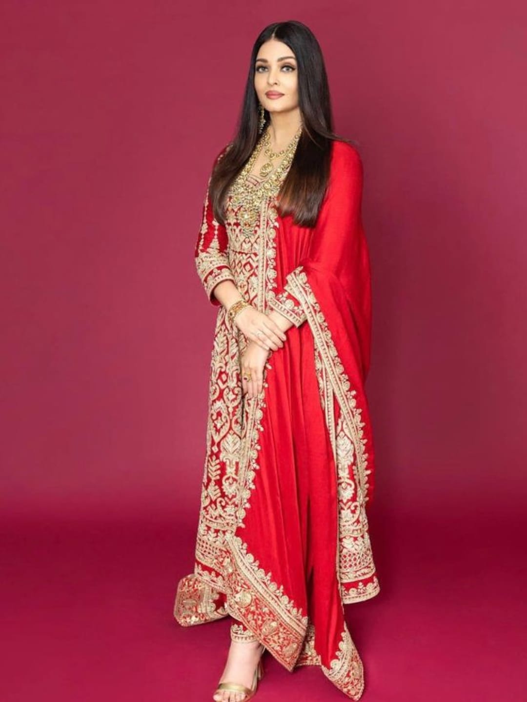 উজ্জ্বল লাল কুর্তা, ফিটেট প্যান্ট ও এমব্রয়ডারির কাজ করা দোপাট্টায় ঐশ্বর্যার থেকে চোখ সরানোই যাবে না।