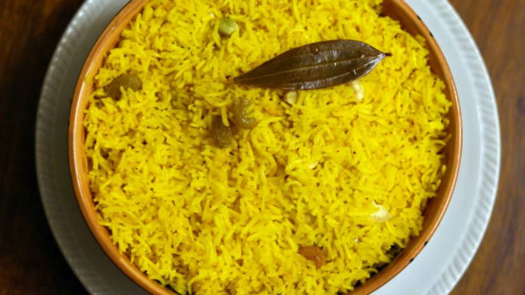 এবার কড়াইতে ঘি গরম করে ওর মধ্যে গোটা গরম মশলা, তেজপাতা, বাদাম, কিশমিশ, চিনি দিয়ে নেড়ে চাল দিন। ১৫ মিনিট পর জল দিন। ফুটে উঠলে ঘি ছড়িয়ে নামিয়ে নিন