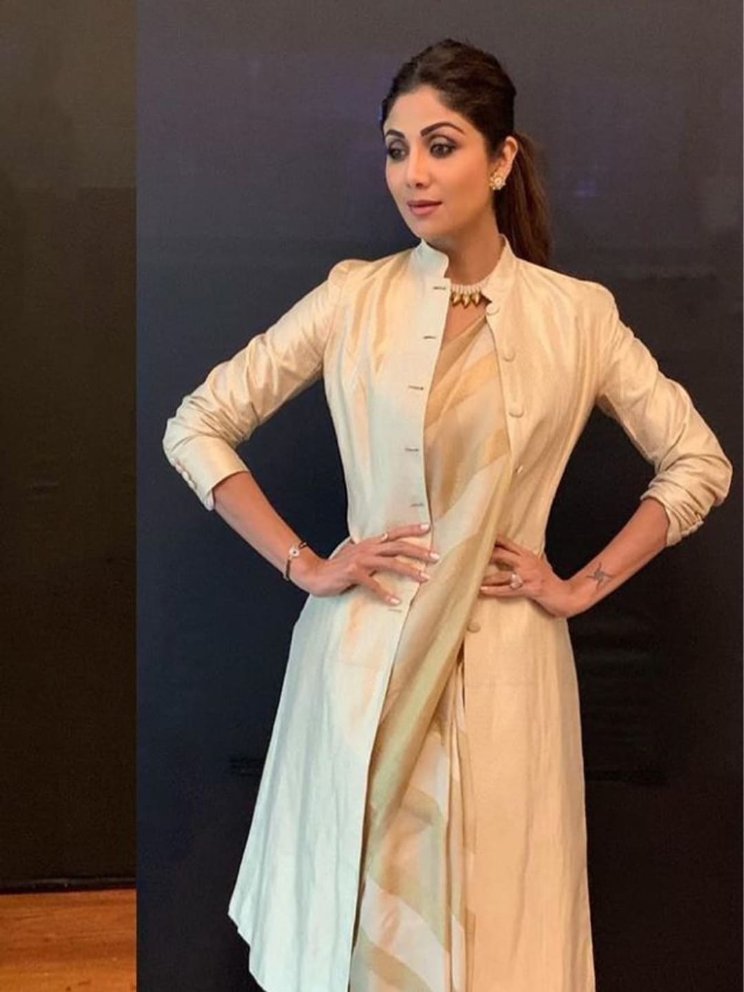 ককটেল বা ওয়েডিং সাজে শিল্পার মতন আইভরি শাড়ির সঙ্গে হাঁটু পর্যন্ত ওভারসাইজড জ্যাকেট পরতে পারেন।