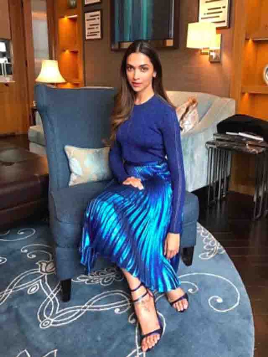 নীল মেটালিক স্কার্ট সঙ্গে 'শিমারি বডিশুট'। যে কোনও লুকে অনবদ্য দীপিকা পাড়ুকোন