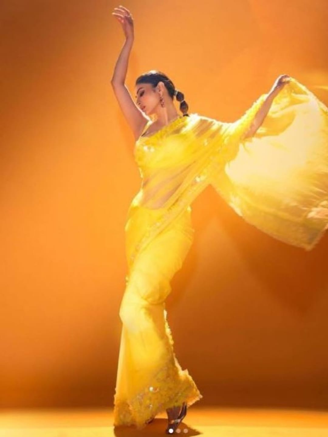 সিক্যুইন্ড হলুদ শাড়িতে তিলোত্তমা মৌনি রায়।