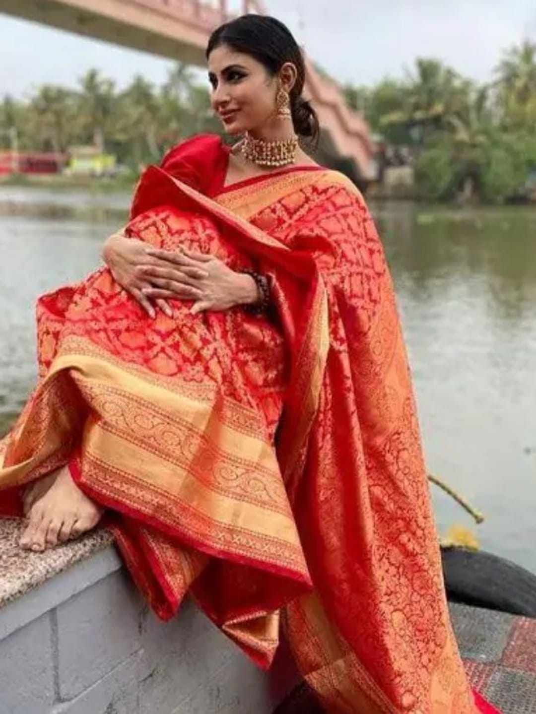 লাল বেনারসিতে উজ্জ্বল মৌনী রায়