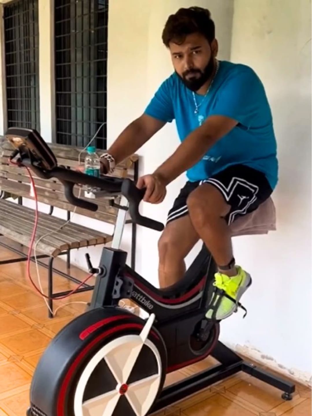রিহ্যাবে সাইক্লিংয়ের ভিডিয়ো শেয়ার করেন ঋষভ। কালো শর্টস এবং নীল শার্ট পরে থাকা ক্রিকেটার প্রশিক্ষকের তত্ত্বাবধানে সাইক্লিং করে গেলেন