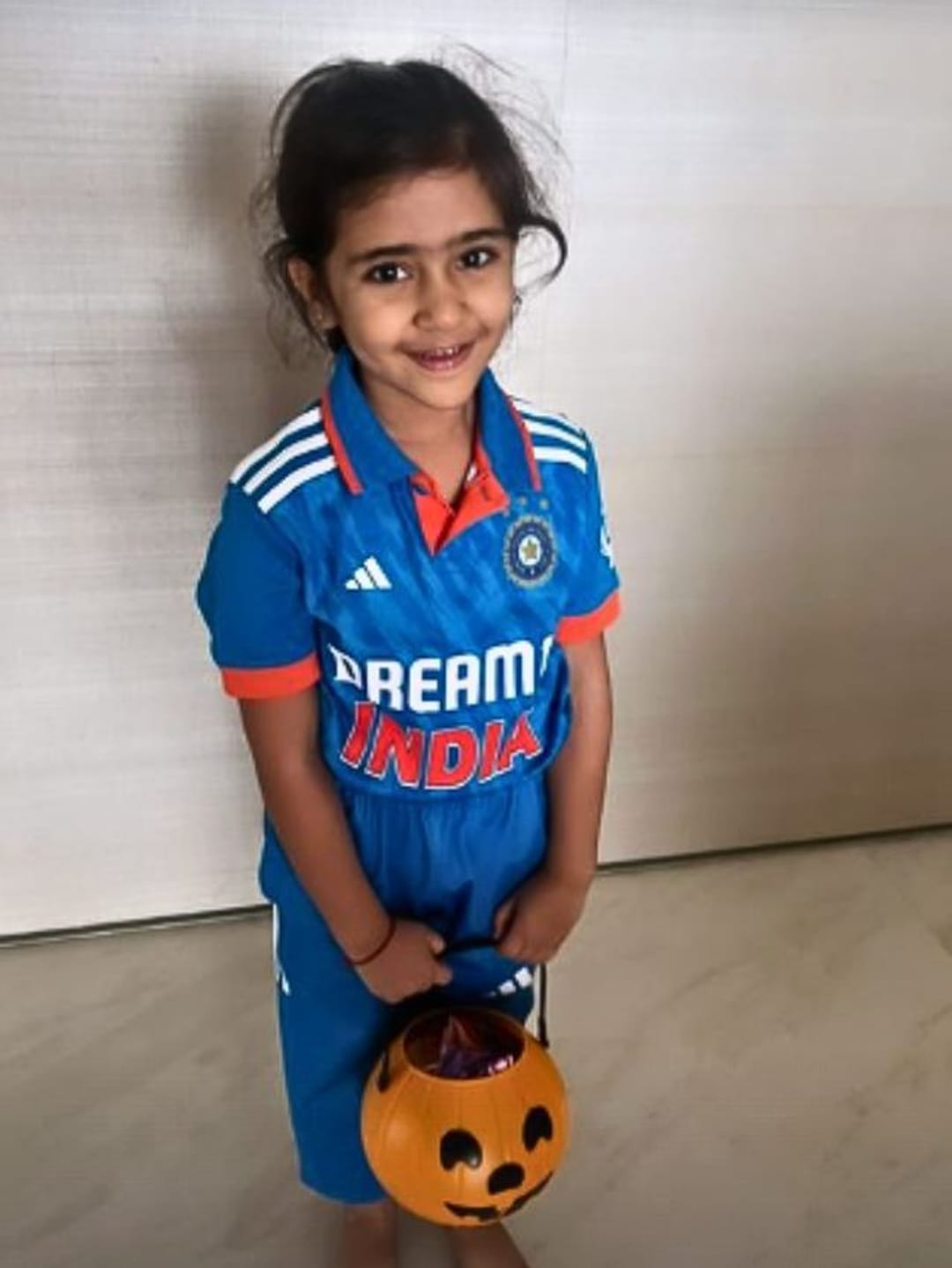 হ্যালোউইনের সাজ এমনিতেই অবাক করার মতো হয়। কিন্তু সামাইরার সাজ ছিল বিরাট চমকে ভরা। কারণ, সামাইরা হ্যালোউইনে পরেছিল ৪৫, রোহিত লেখা জার্সি।