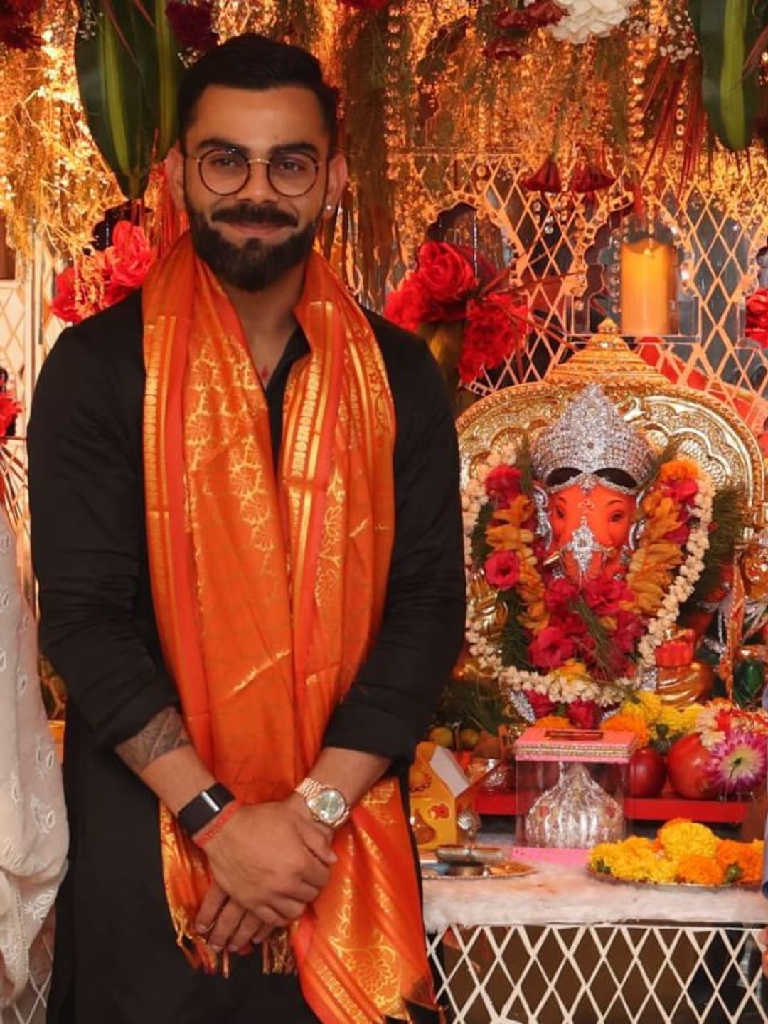 গণেশ চতুর্থী উপলক্ষে বিরাট কোহলি তাঁর এক বন্ধুর বাড়িতে গিয়েছিলেন। তাঁর পরনে ছিল কালো কুর্তা আর পাজামা।